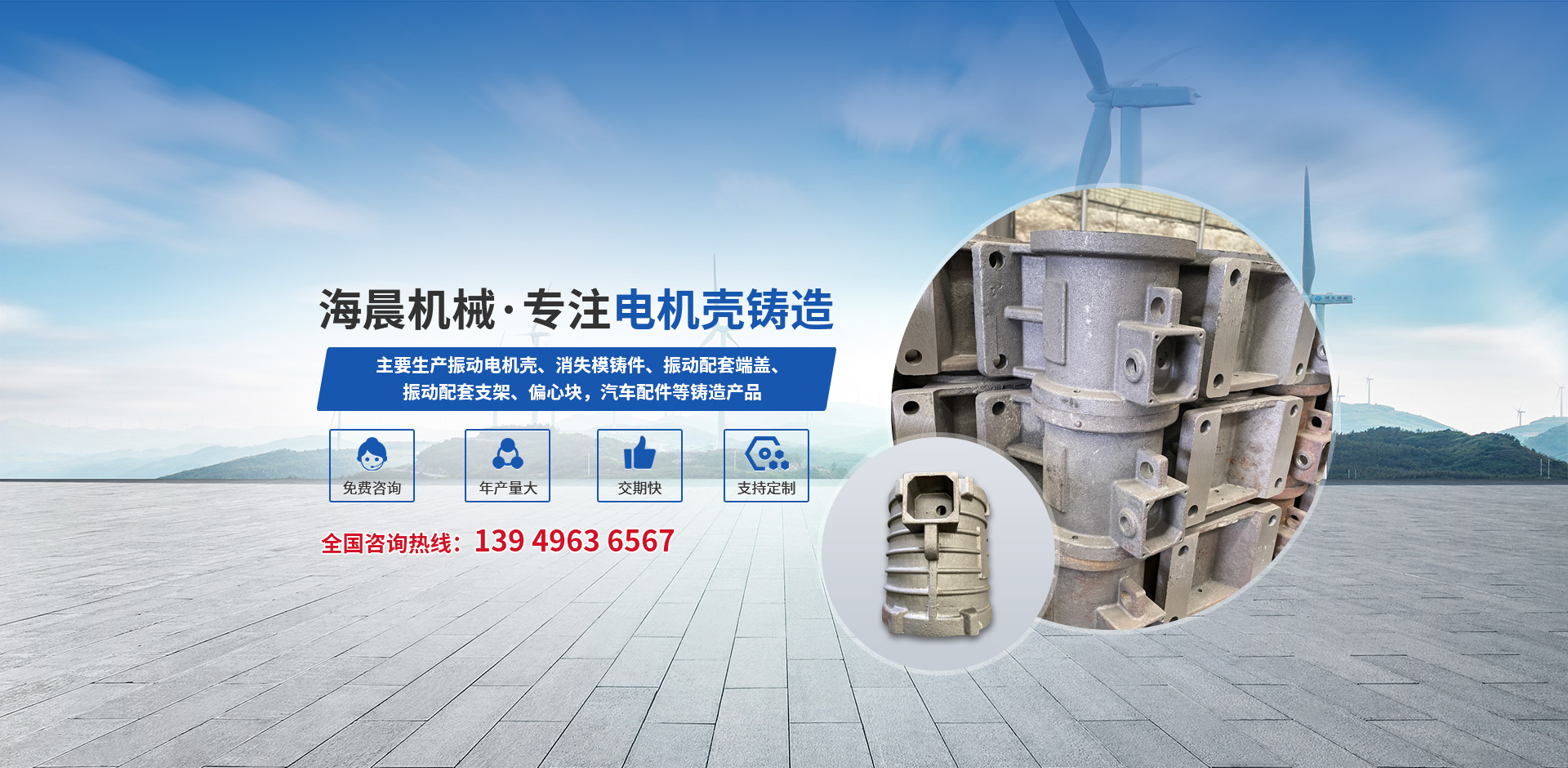 新鄉(xiāng)縣海晨機(jī)械有限公司,始建于1996年,我公司擁有垂直造型生產(chǎn)線,年設(shè)計(jì)產(chǎn)量5萬(wàn)噸,主要生產(chǎn)振動(dòng)電機(jī)殼、消失模鑄件、振動(dòng)配套端蓋、振動(dòng)配套支架、偏心塊,汽車(chē)配件等鑄造產(chǎn)品,公司占地面積1500平方米,現(xiàn)有員工100余人,其中工程師5名,技工12名,固定資產(chǎn)1500萬(wàn),擁有生產(chǎn)設(shè)備60多臺(tái)(套)。我們遵循“團(tuán)結(jié)、敬業(yè)、創(chuàng)新”的敬業(yè)精神,始終堅(jiān)持以技術(shù)為后盾,以質(zhì)量求發(fā)展,以客戶(hù)需求為己任,不斷致力......